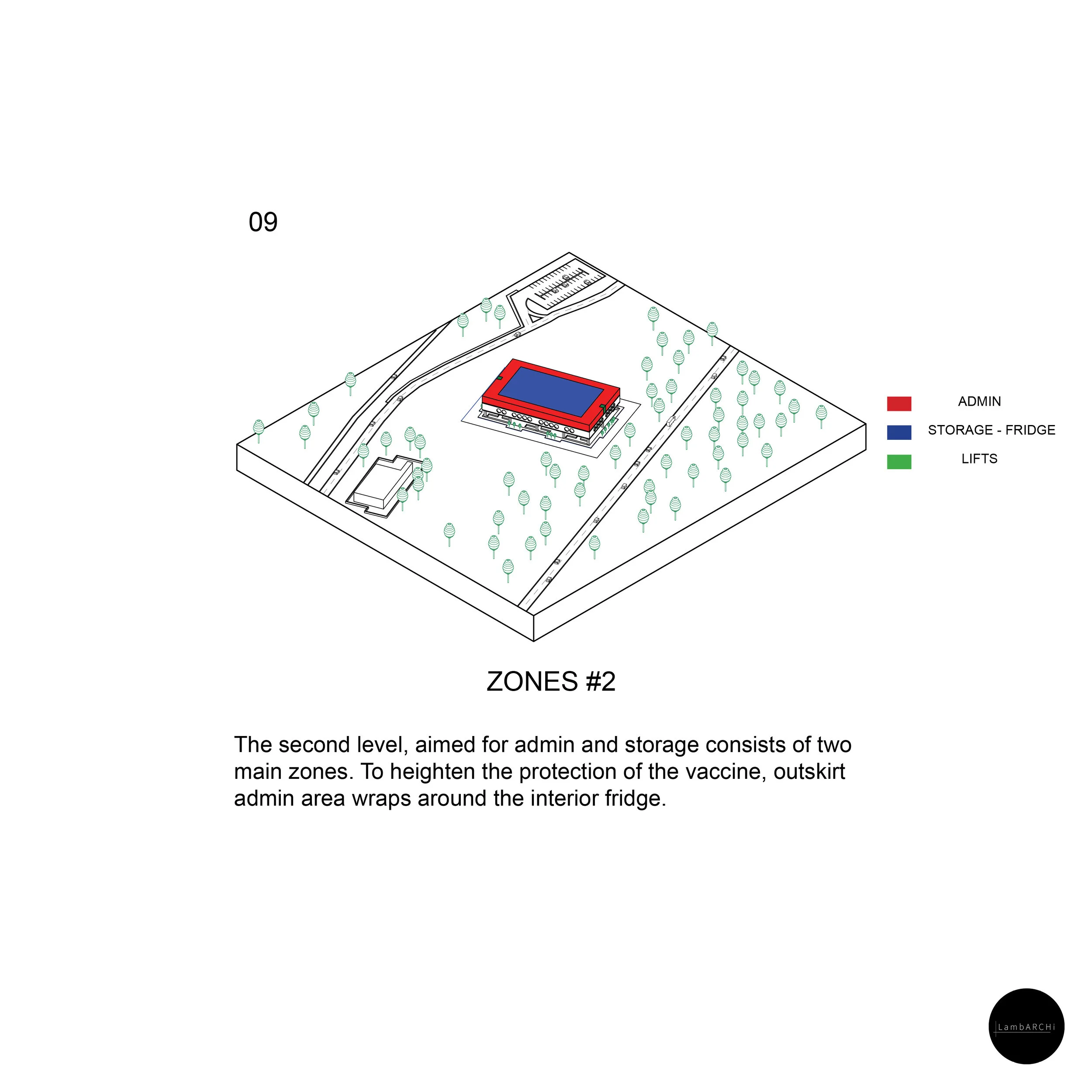 The second level shows the storage fridge being wrapped by the admin (office) space; a gesture which creates a layer of protection for the vaccine to be stored,